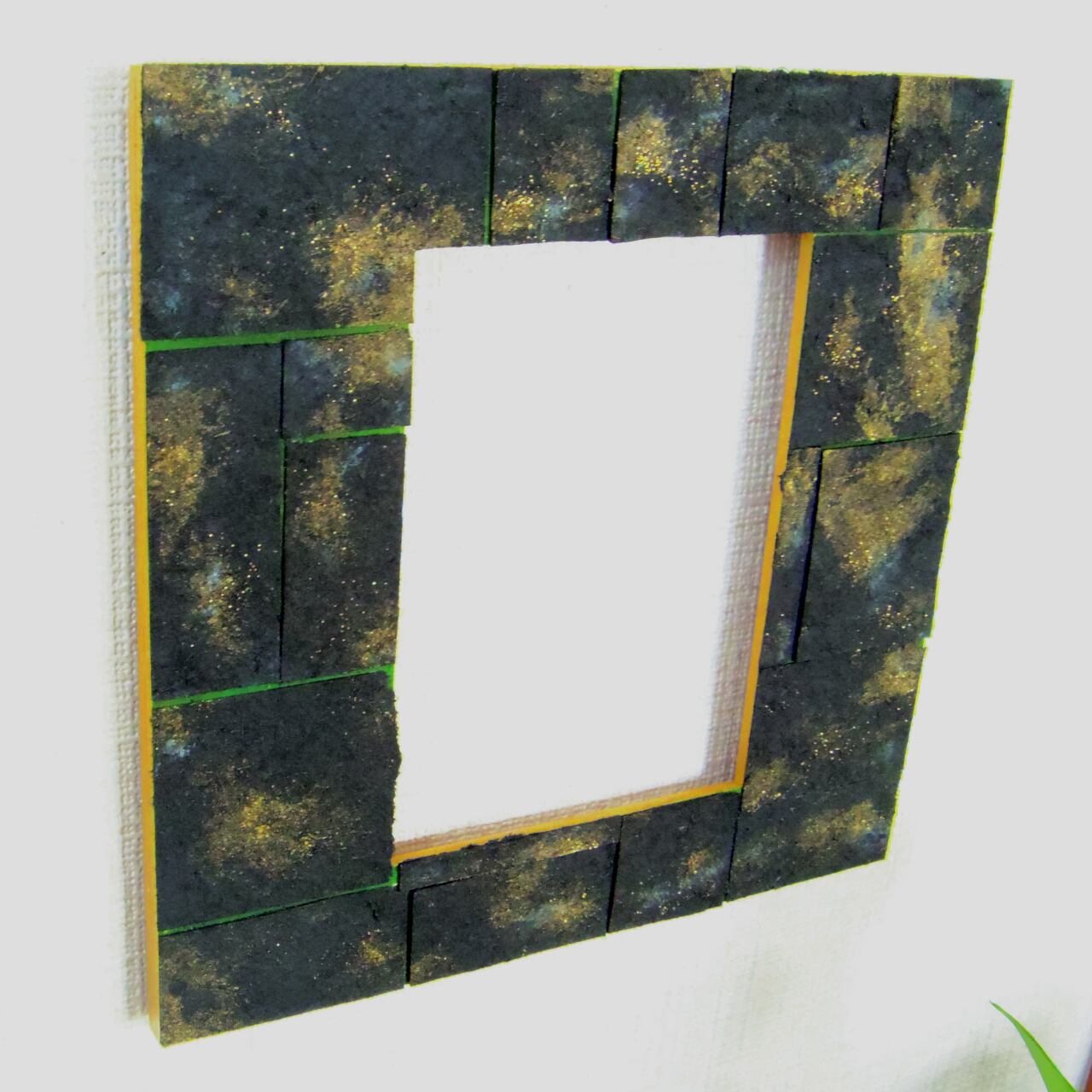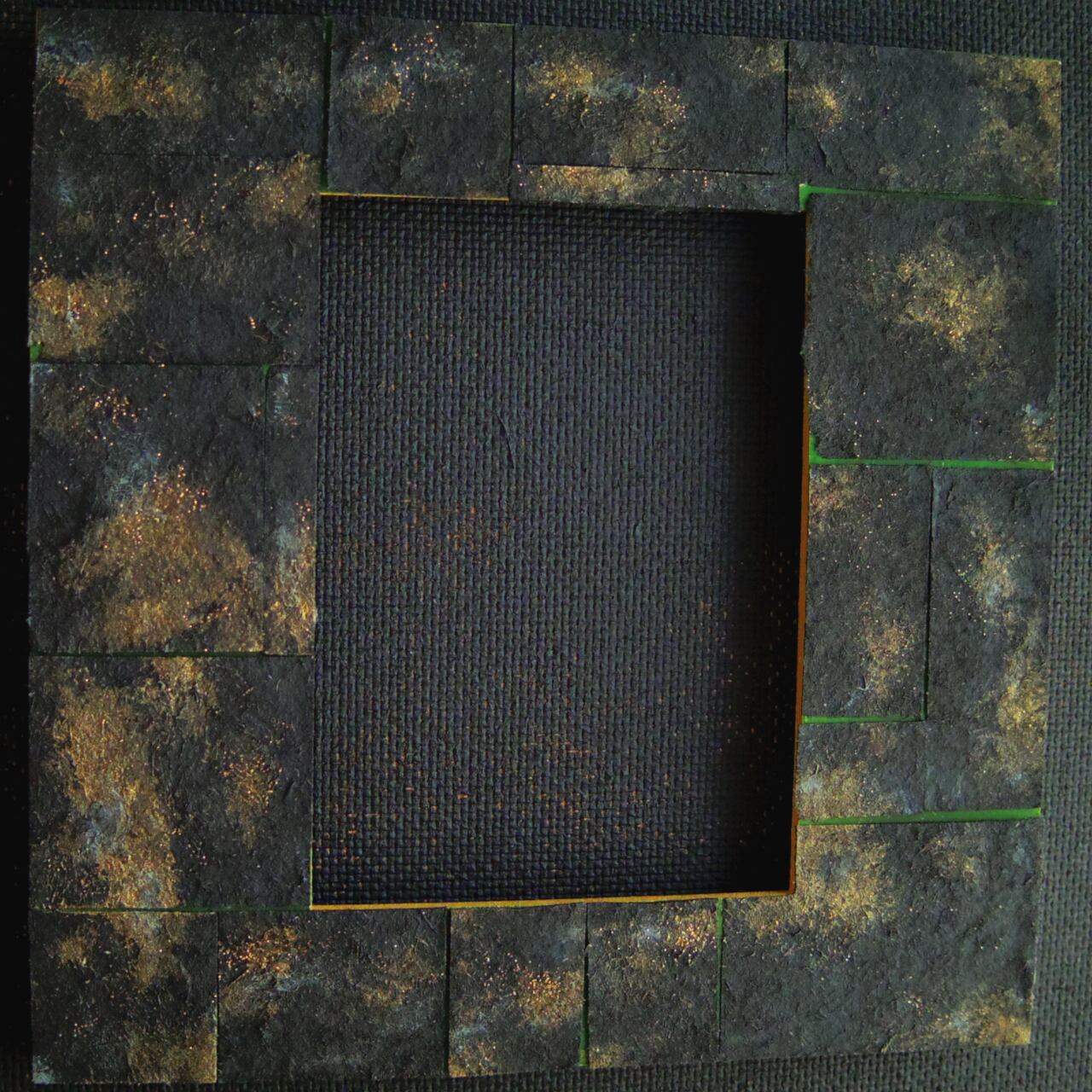 土台の額縁を緑に染め、その上に黒を基調とし、アンティークの装いに塗布した繊維版を敷きつめました。